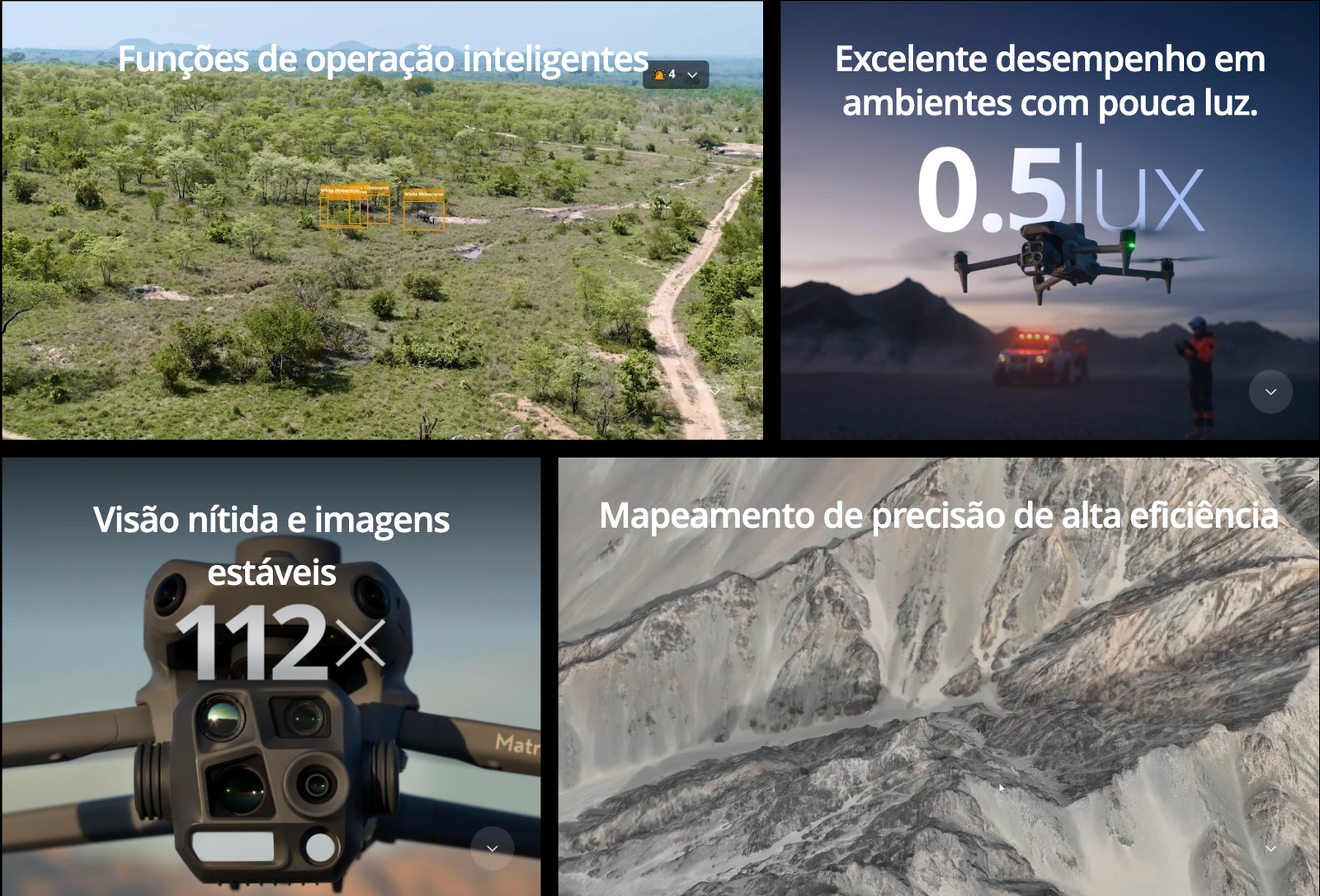 A série Mavic 3 Enterprise redefine os padrões da indústria para drones comerciais de pequeno porte. Com um obturador mecânico, uma câmera com zoom de 56x e um módulo RTK para precisão em nível de centímetro, o Mavic 3E eleva o mapeamento e a eficiência das missões a um novo patamar. Uma versão térmica está disponível para combate a incêndios, busca e salvamento, inspeção e operações noturnas.